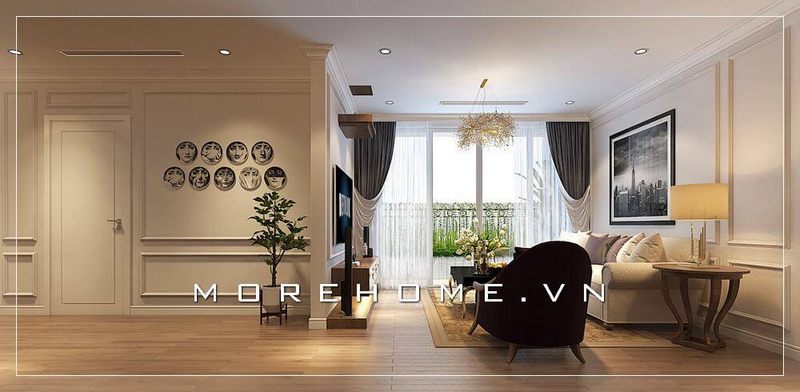 . Thiết kế phòng khách chung cư đẹp là sự kết hợp giữa nội thất tân cổ điển và đường nét tinh tế, tạo nên một vẻ đẹp sang trọng và đẳng cấp.